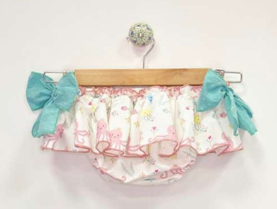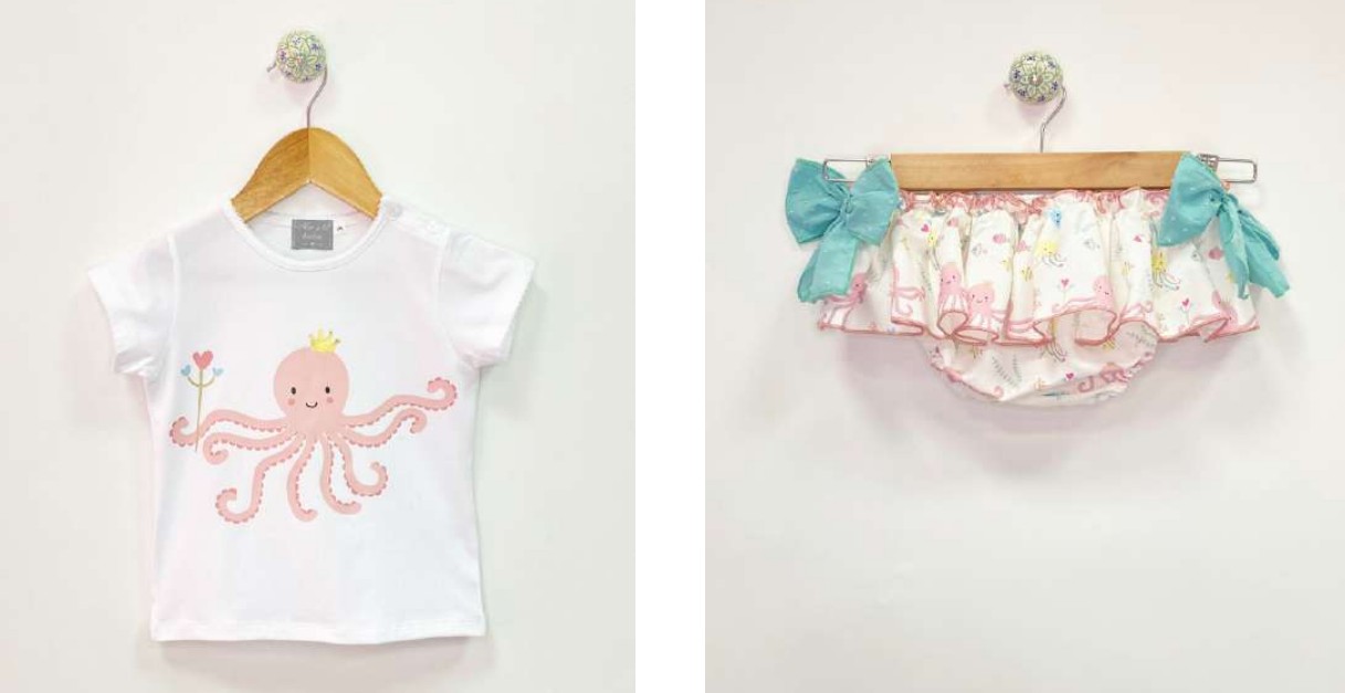 Dibujo estampado de pulpo y braguita con estampado de fondo marino acompañada volante con mismo estampado,