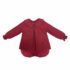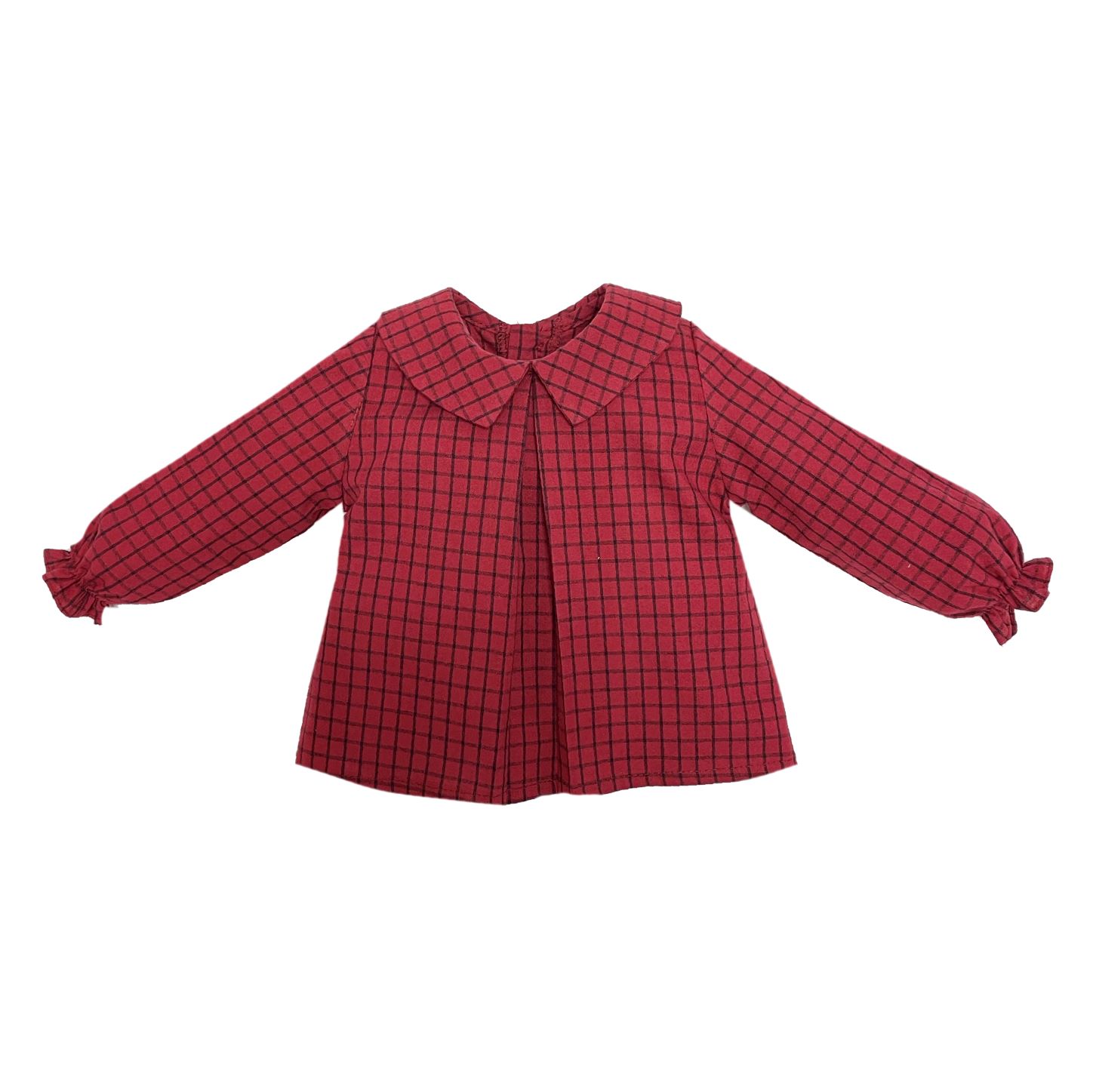 Está confeccionado en tela roja de cuadros negros y cuenta con volantes en los puños de las mangas.