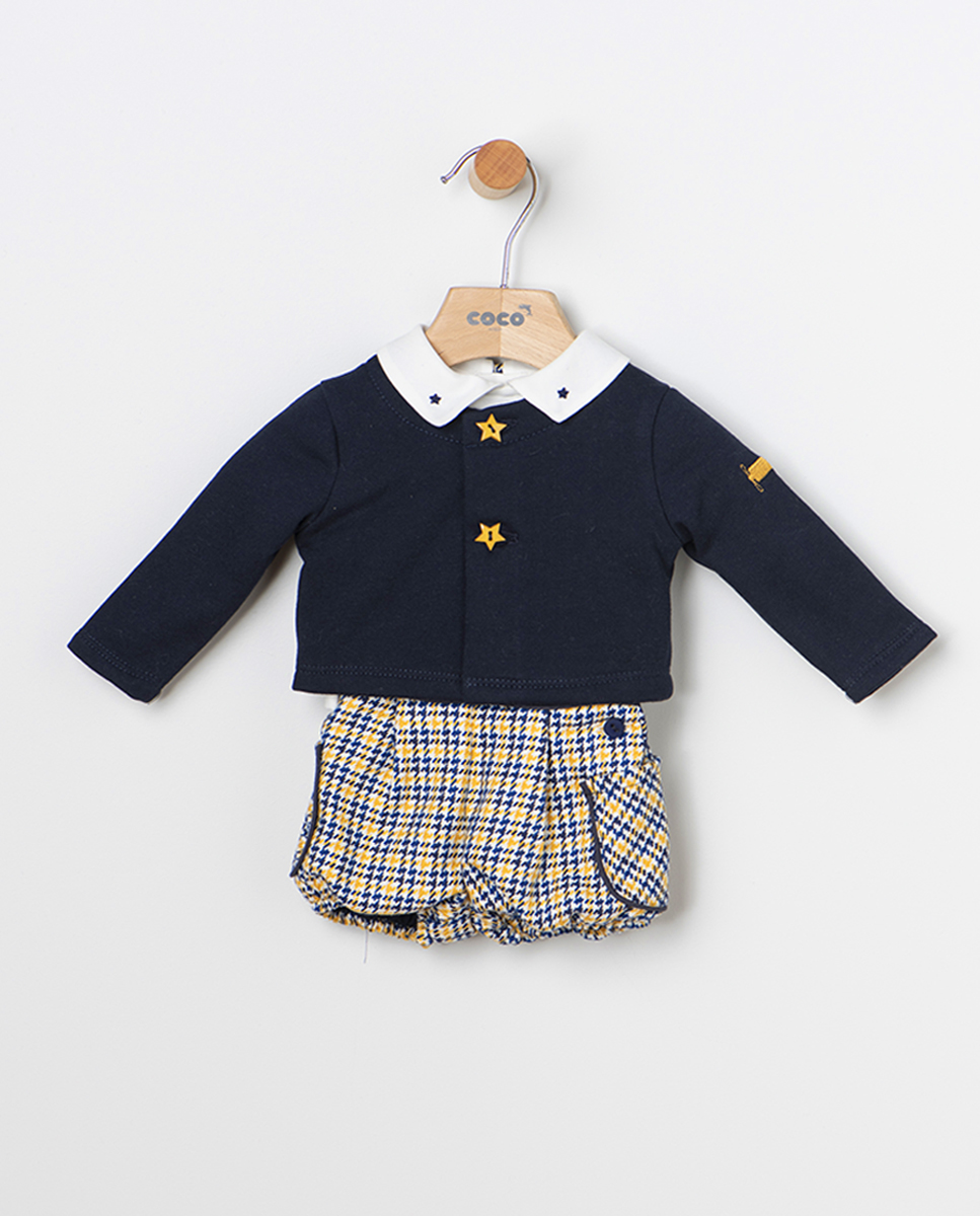 Conjunto bebé niño familia estrella de Coco Acqua compuesto por tres piezas. Chaquetita azul marino con dibujo de estrella en color amarillo mostaza, bordado en la parte izquierda de la manga.
