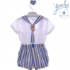 Pantalón estilo marinero a rayas azules y amarillas con tirantes a juego.