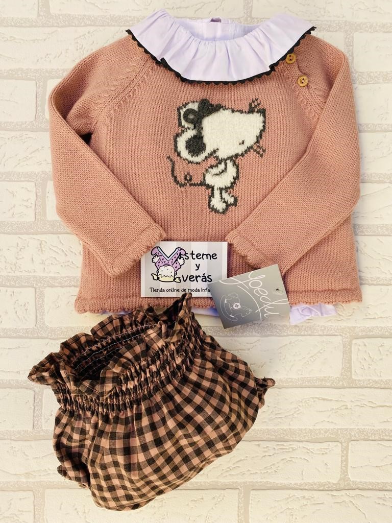 Jersey de punto en tono rosa empolvado con estampado de Ratoncito. Blusa con aplique bordado en volante y espectacular pololo vichy a juego.