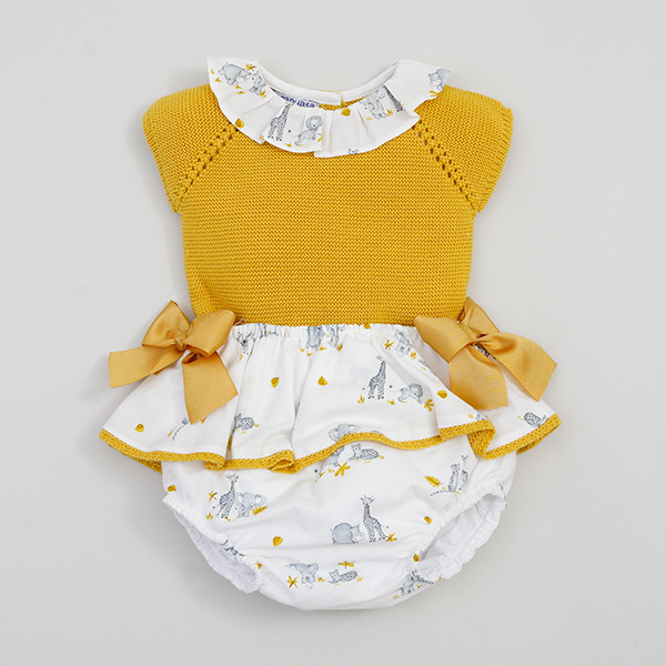 Precioso volante en el cuello con estampado de animalitos a juego con la braguita