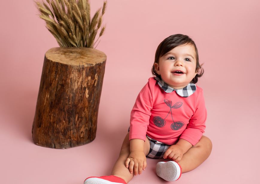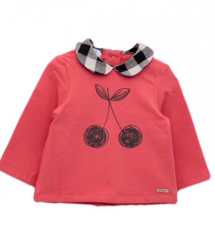 Formado por sudadera de color rosa intenso, tipo sandía,o color coral, con cuello estilo camisa a cuadros grises y negros.