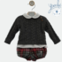 Jersey de punto con dibujo de relieve en tono gris, donde le acompaña blusa blanca con volante en cuello.