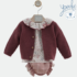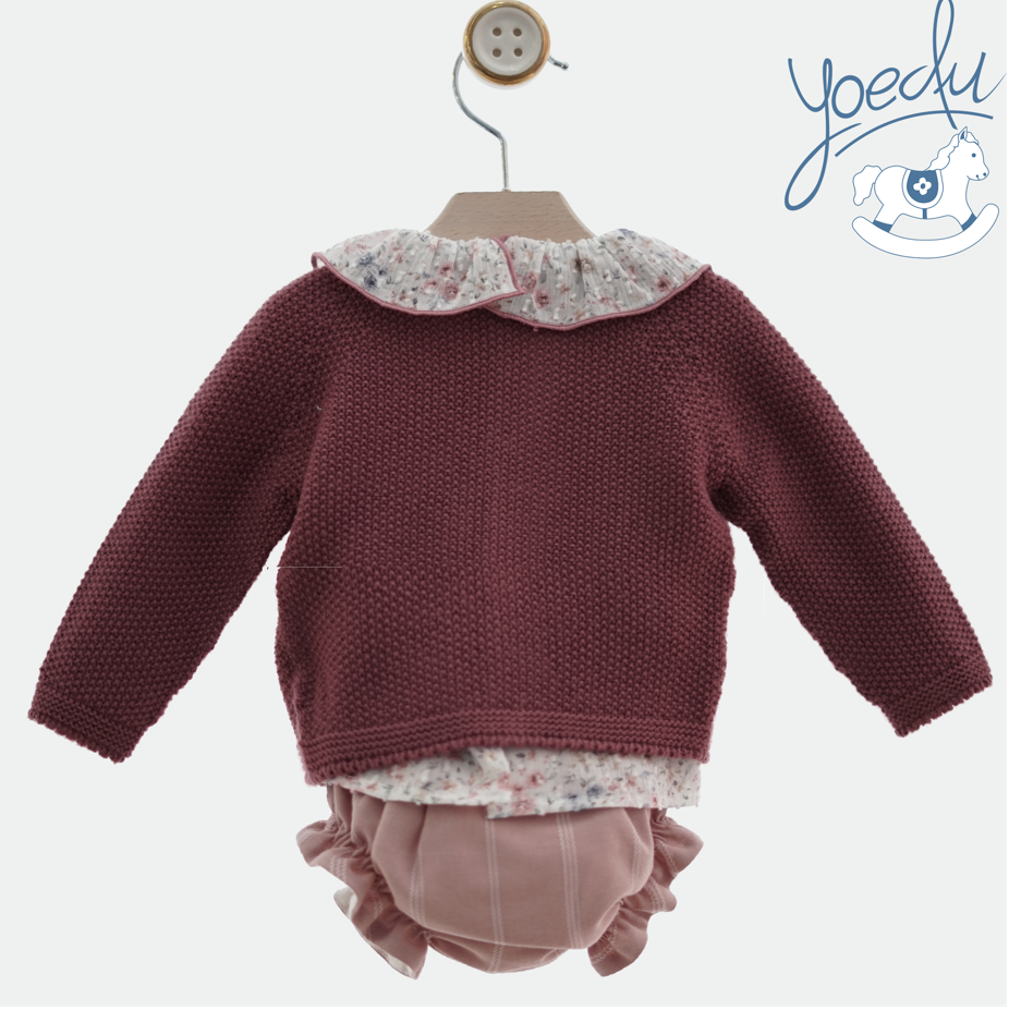Jersey de punto en tono granate con cierre abotonado en la parte delantera. Le acompaña su espectacular blusa de flores en tonos rosas.