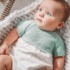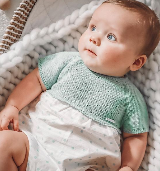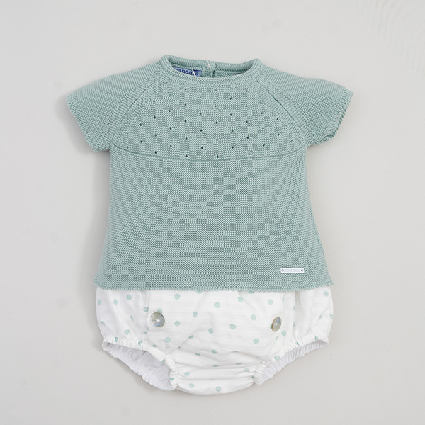 Jersey de punto en tono verde menta con cubrepañal en tejido blanco y estampado de topos en el mismo tono que el jersey.