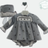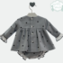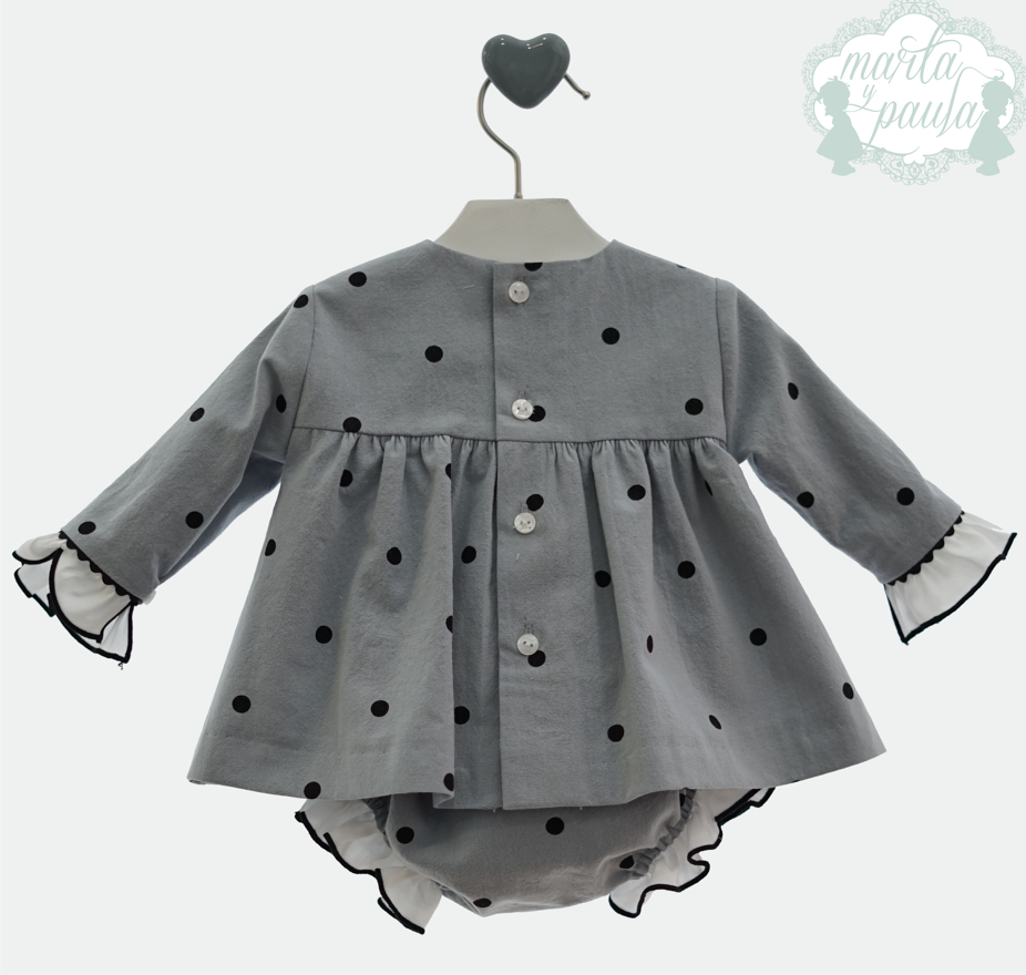 Estampado en tono celeste empolvado con topitos donde resaltan sus volantes blancos en pecho y puños.