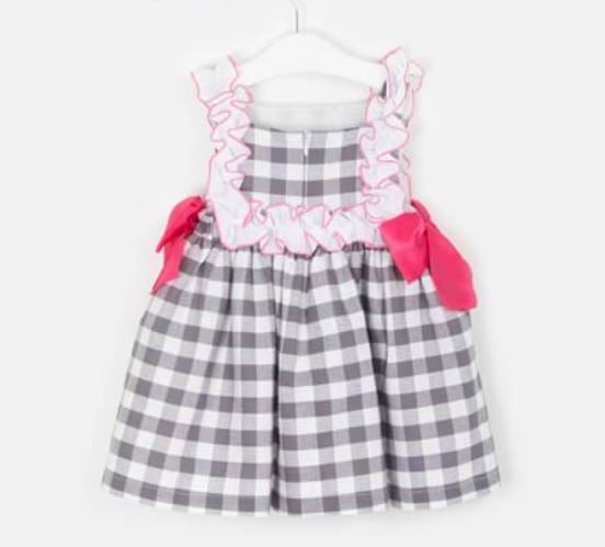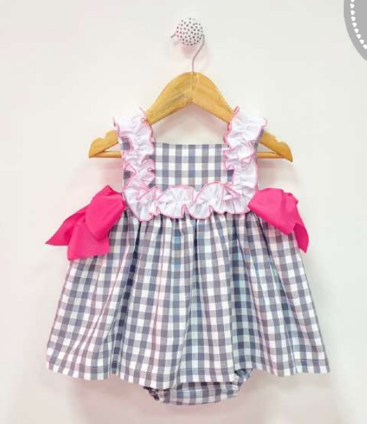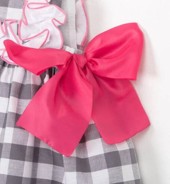 Estampado a cuadros grises, con detalle de volantito blanco ribeteado en color fucsia y bonitos lazos fucsia en los laterales del talle.