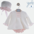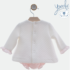 Puños fruncidos con volantes y detalle en el pecho. Le acompaña preciosa capota y braguita a juego en tono rora. Cierre abotonado en la parte de atrás
