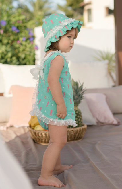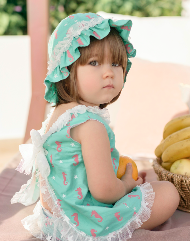 Traje de baño bebé niña Miranda con estampado de caballitos de Mar compuesto de vestido y gorro.