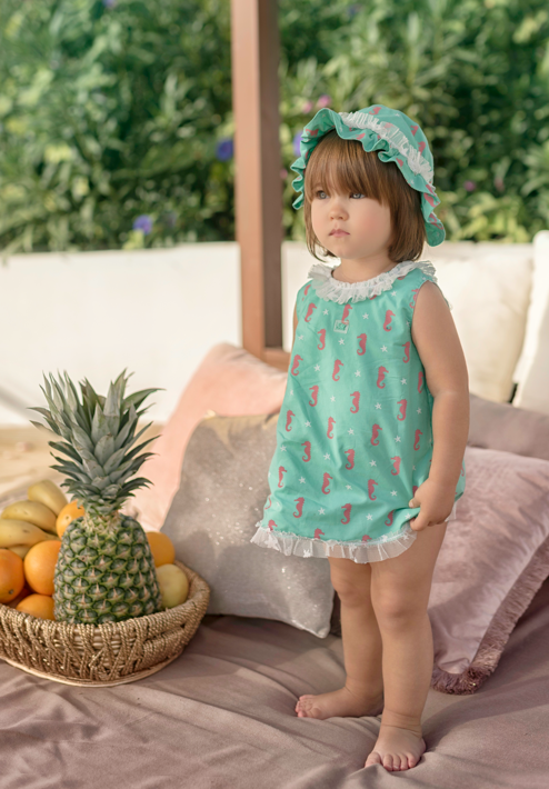 Traje de baño bebé niña con estampado de Caballitos de Mar, de Miranda compuesto de vestido y gorro.