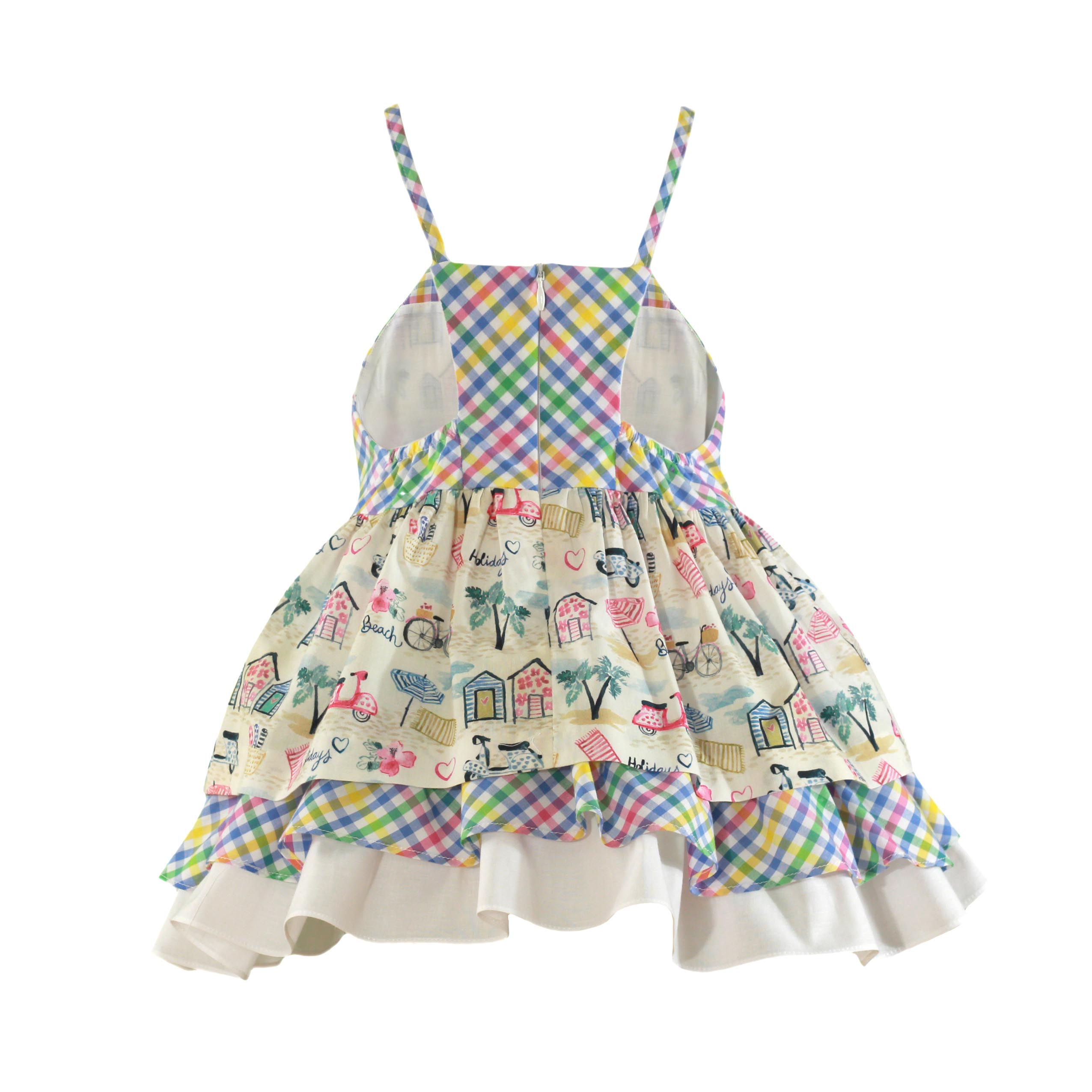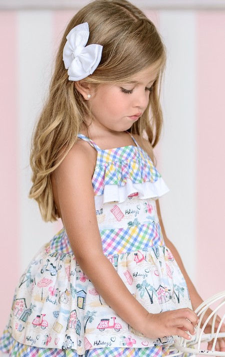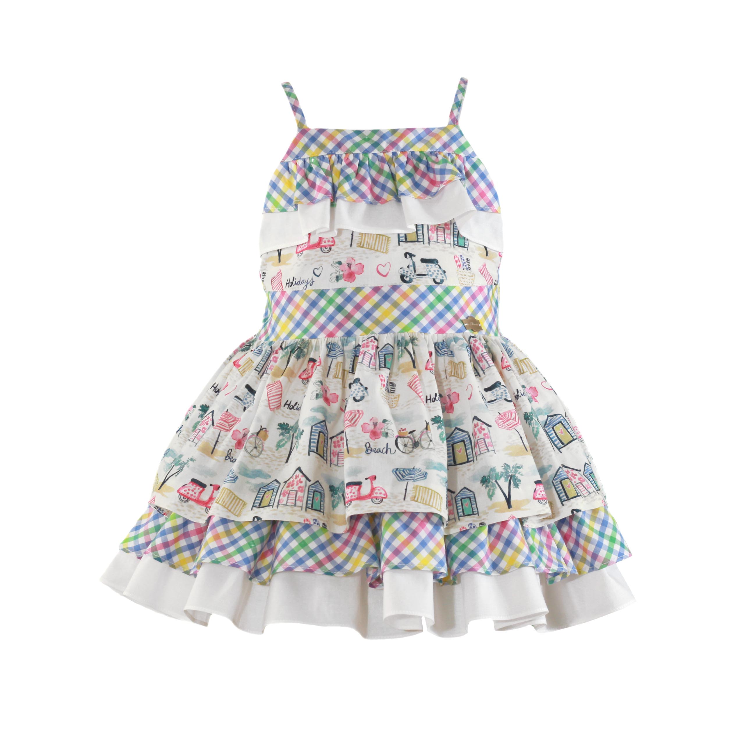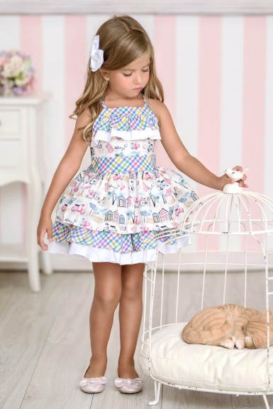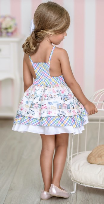 Vestido niña de doble forro combinado con dos tipos de estampados. Tendencia verano 2021.