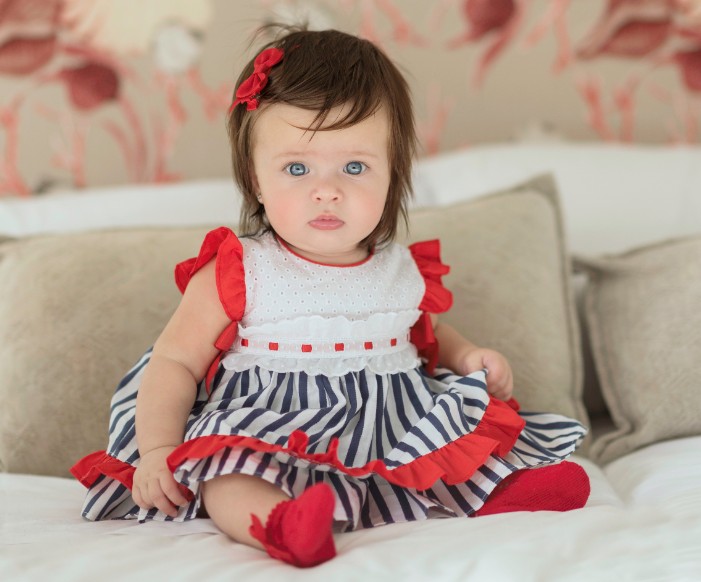 Vestido bebé niña estilo marinero en tonos rojos, blancos y azules.