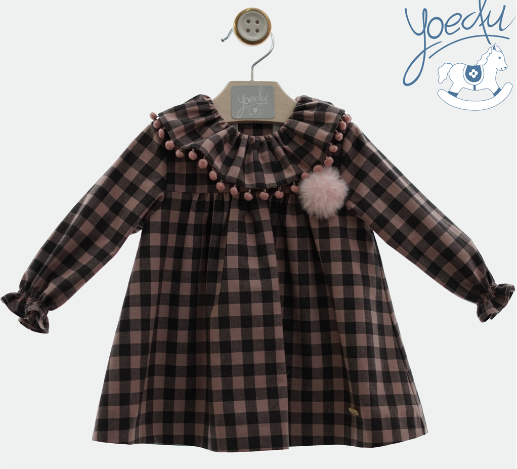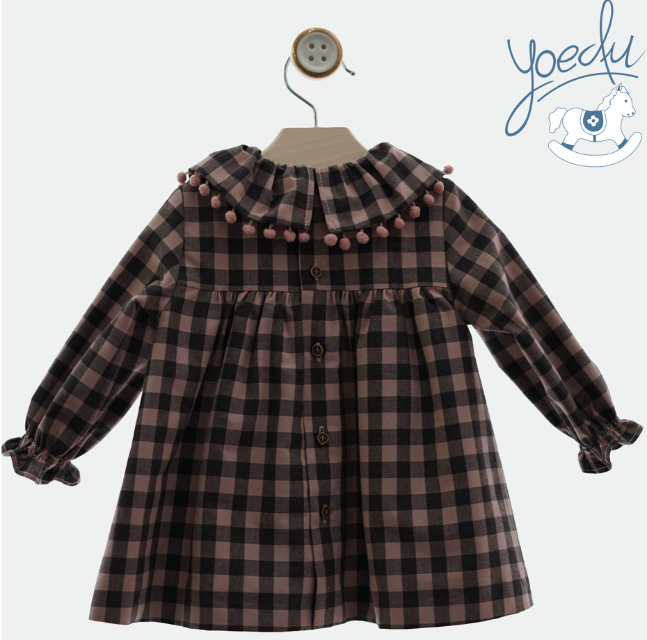 Precioso vestido niña Yoedu Familia Pompeya a cuadros en tonos rosas y negros.