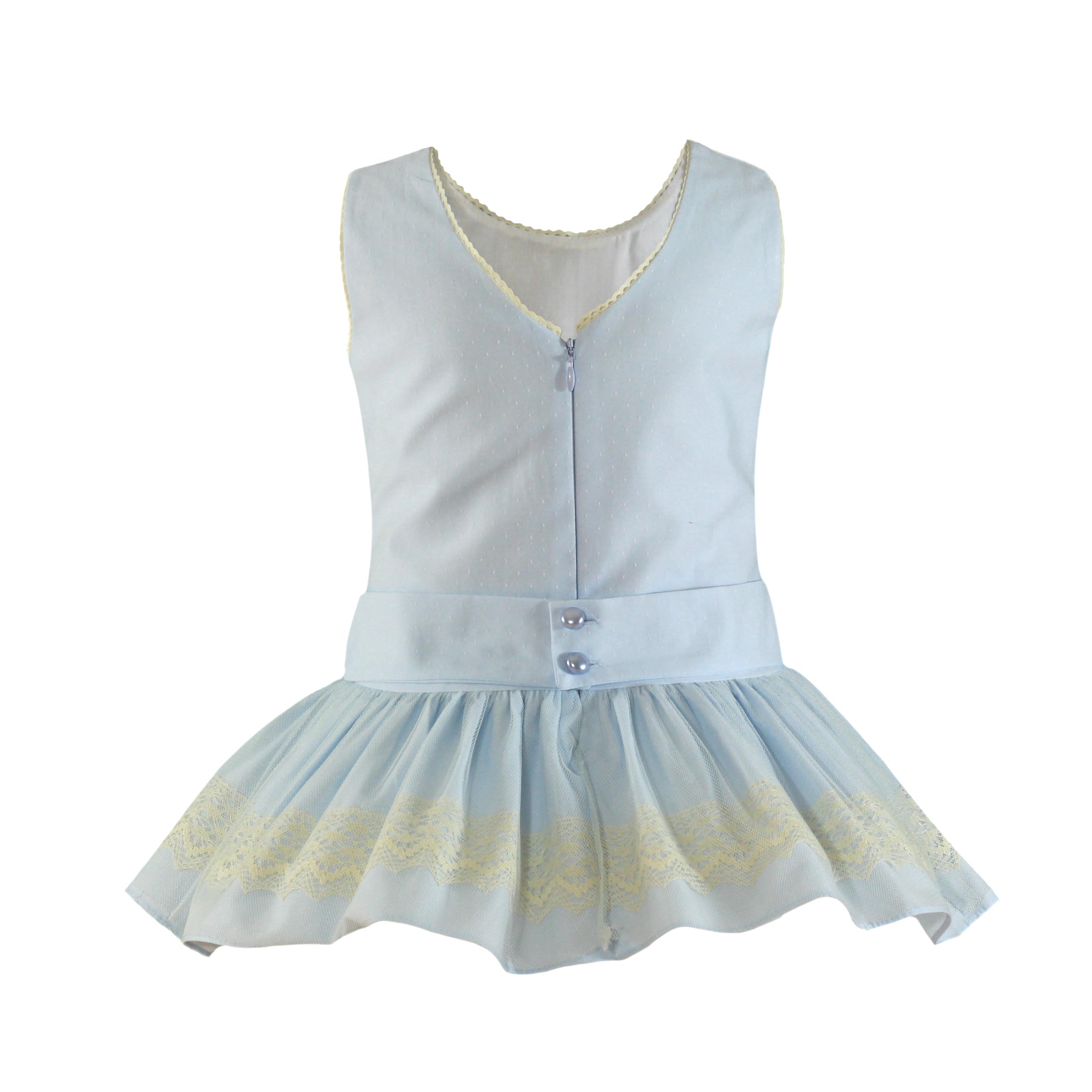 Espectacular vestido de niña de Miranda para evento especial o ceremonias, en tejido color celeste y tul con transparencias de encaje bordados.