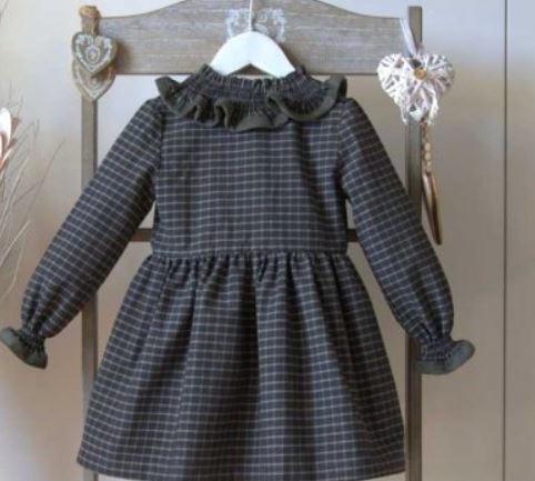 Vestido verde cuadros TREE de manga larga y corte en la cintura, que se presenta completamente abierto en la parte delantera donde presenta tapeta de micropana verde lisa y sobre ella bonitos botones de madera. Está confeccionado en tela de cuadros verde separados por rayas verde más claro, y cuenta con cuello volante smoke partido por la mitad y acabado en el filo con tela de micropana verde, así como puños con franja ancha engomada de punto smoke y acabados en volante con terminación de micropana verde en el filo. De la COLECCIÓN TREE de la casa de moda infantil y juvenil EVE CHILDREN, invierno 2022.