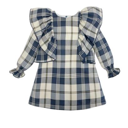 Vestido de cuadros escoceses en tonos beige, azul marino y camel. Manga larga.