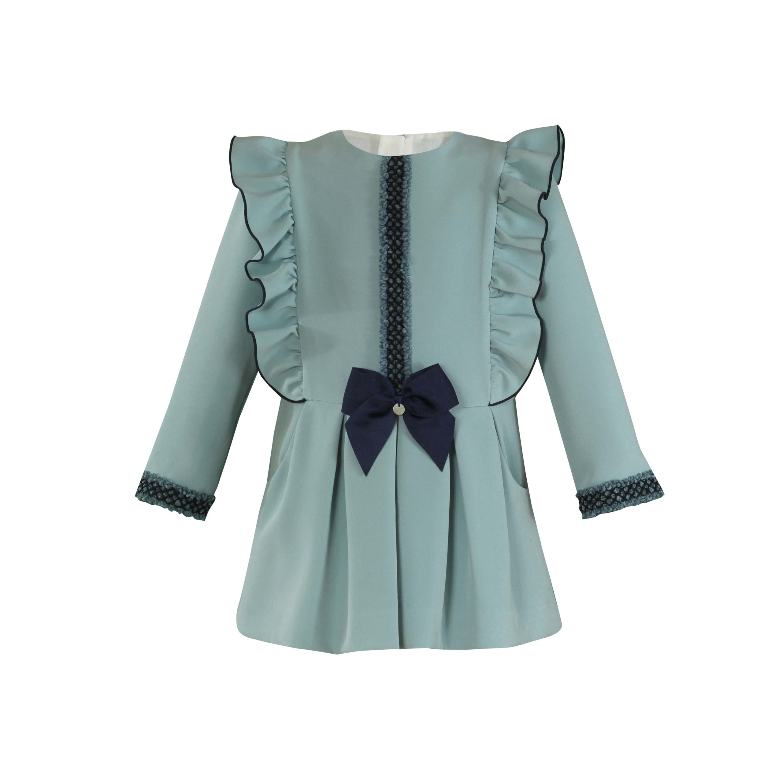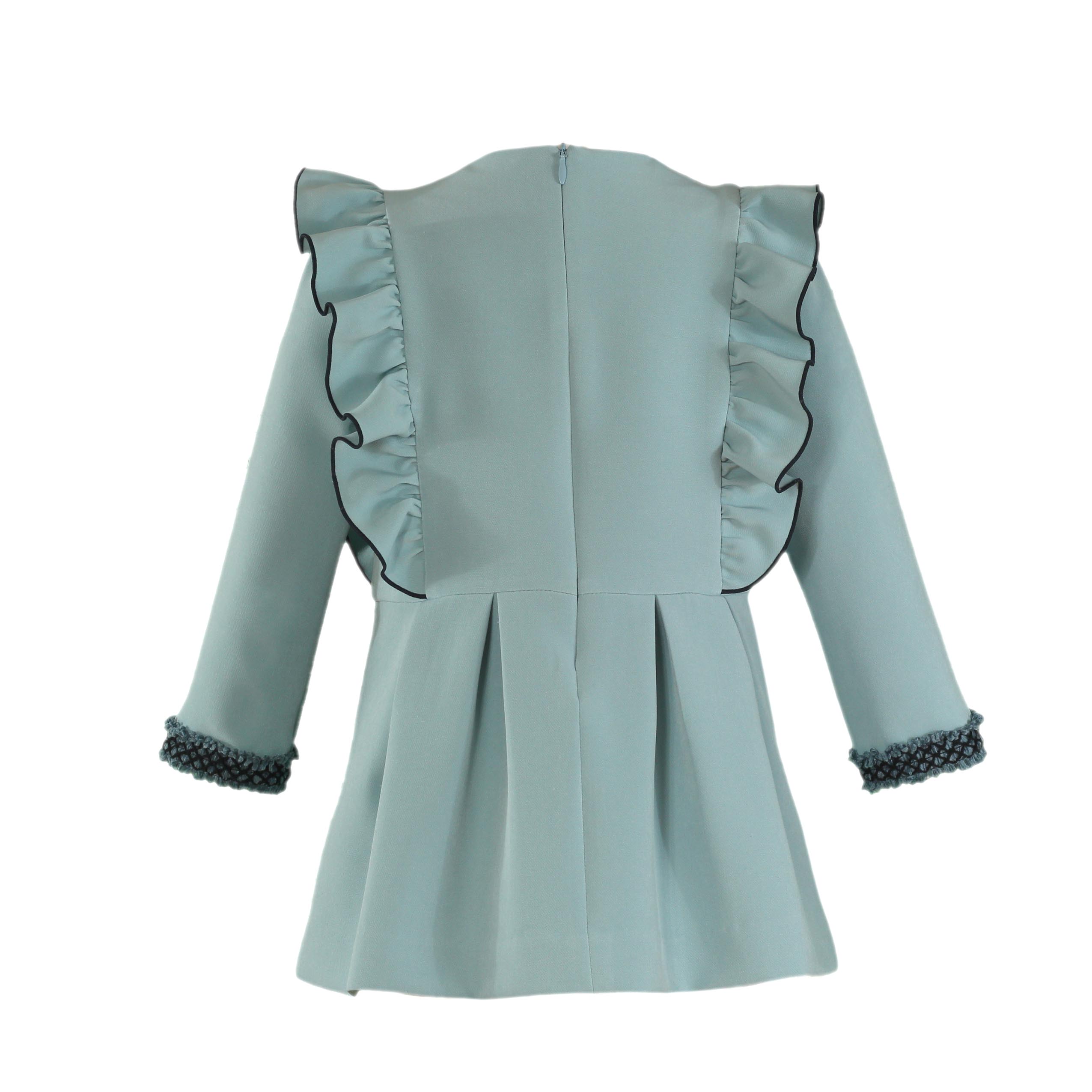 Precioso vestido niña en tono verde agua, con precioso lazo a la altura de la cintura y volantes en los laterales.